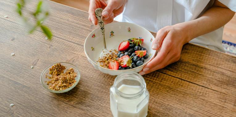 - In a bowl, mix the Matcha Vegan Plant Protein Powder, Low-Fat Greek Yogurt until well combined. Pro tip – Use a frother to make it smooth and clump free.
